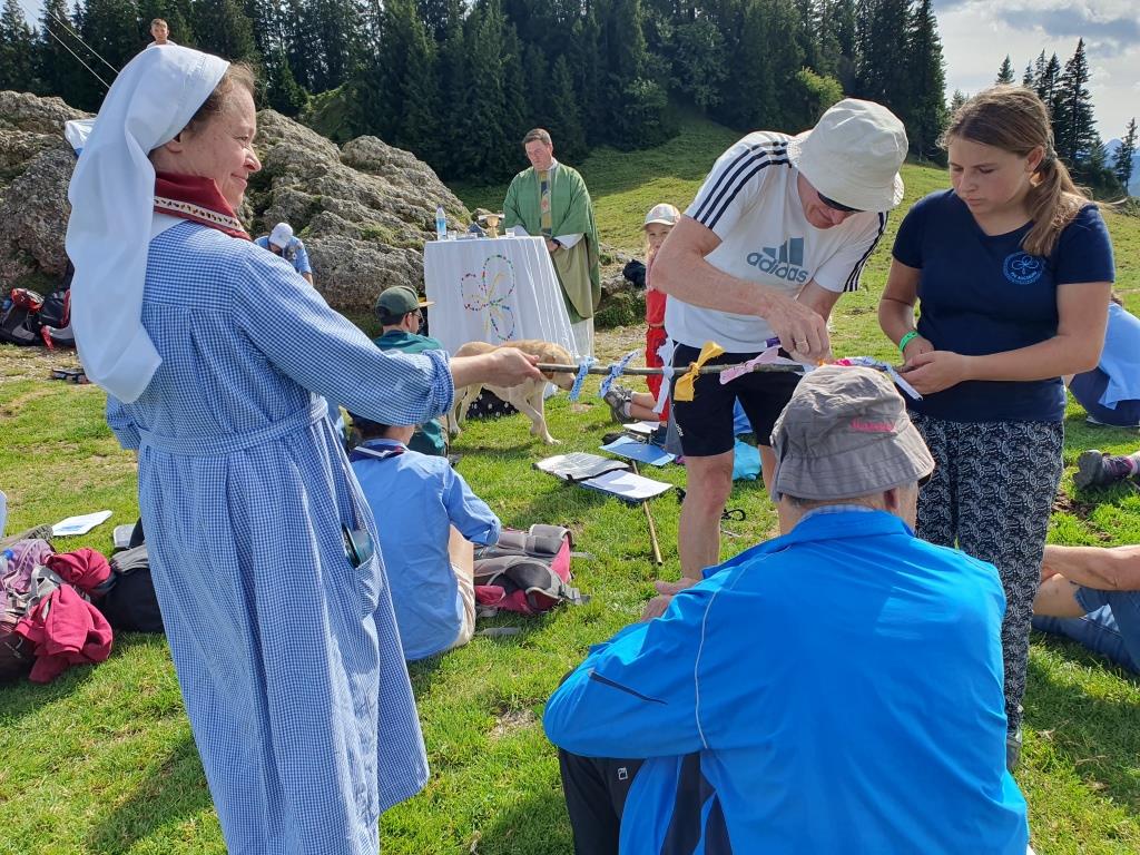 Freude und Euphorie weckte auch die musikalische Begleitung mit Gitarre, Ukulelele und Cajón. Wir freuten uns sehr, dass sich uns viele Gäste anschlossen, die unterwegs von der Bergmesse gehört hatten. Mit dabei waren auch tierische Weidebewohner, die das Geschehen mit Interesse verfolgten und sich auch einige Streicheleinheiten abholten.