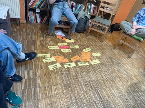 Ein Highlight war das Antidiskriminierungstraining, bei dem wir uns mit der „Kugellager“-Methode zu sexistischen und queer feindlichen Aussagen positionieren konnten, um eigenständig Strategien gegen Diskriminierung zu entwickeln. Danach konnten die Teilnehmenden den „Regenbogen“-Koffer erkunden und gemeinsam Methoden aus dem Koffer ausprobieren.