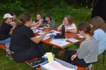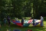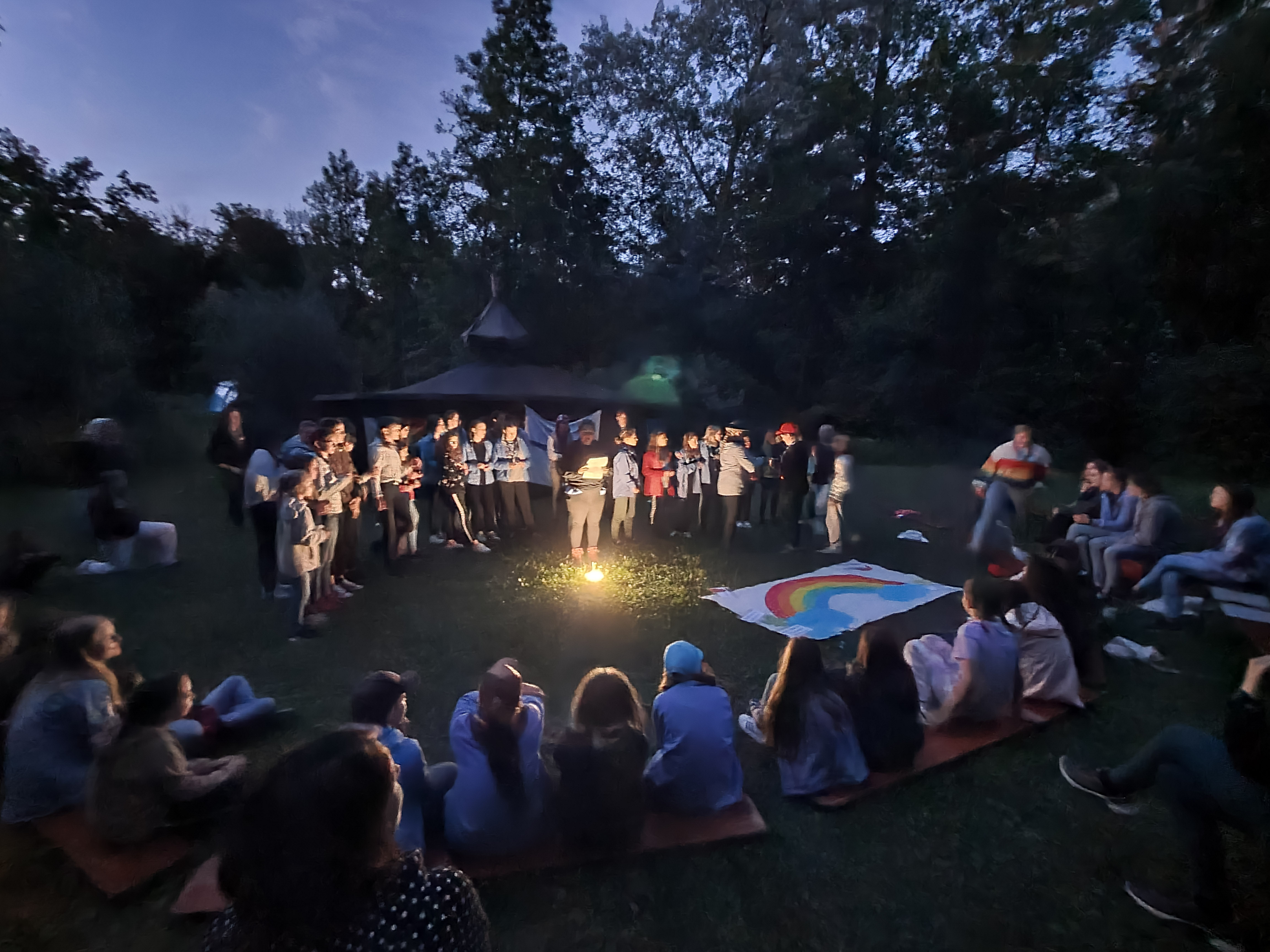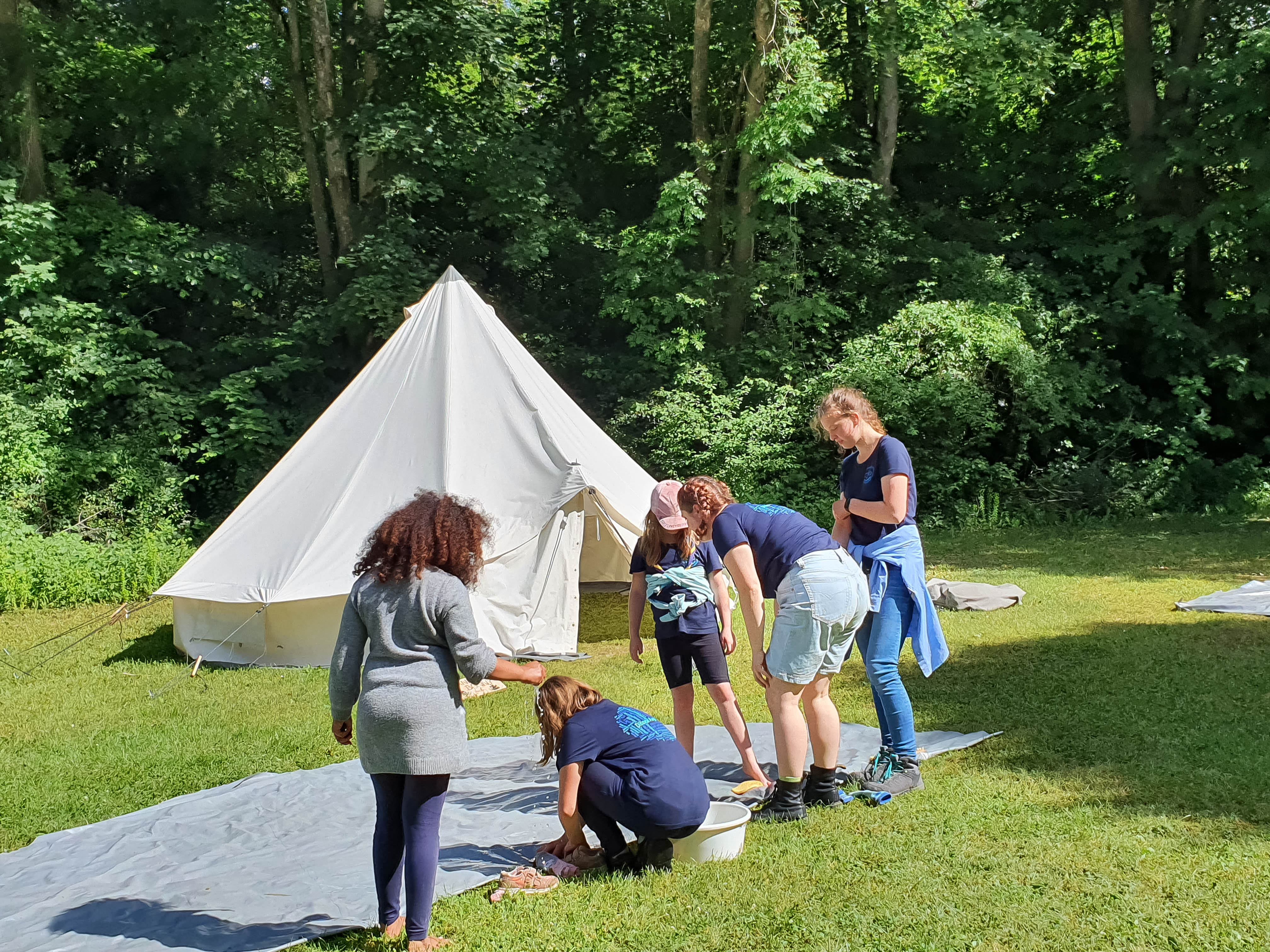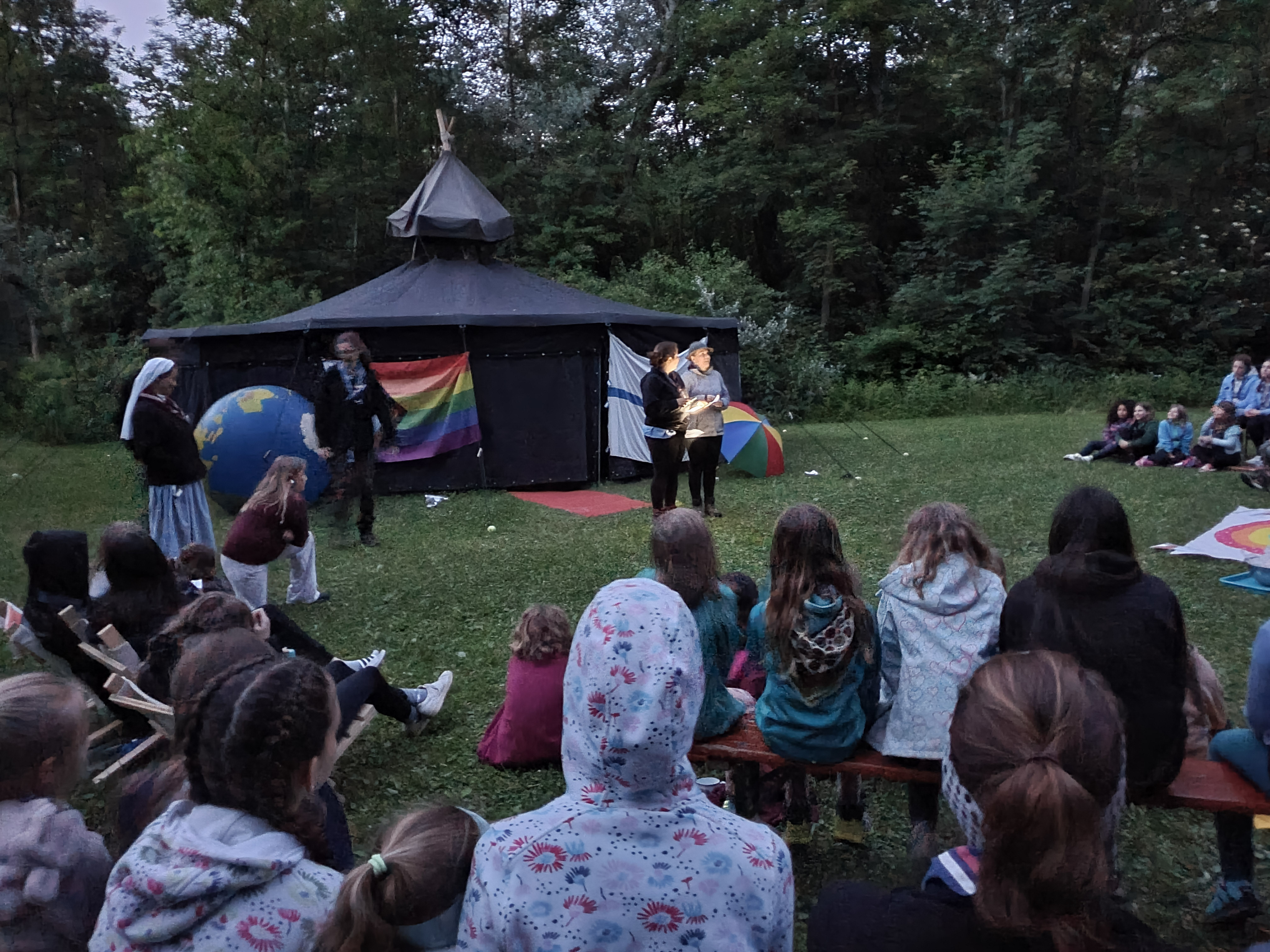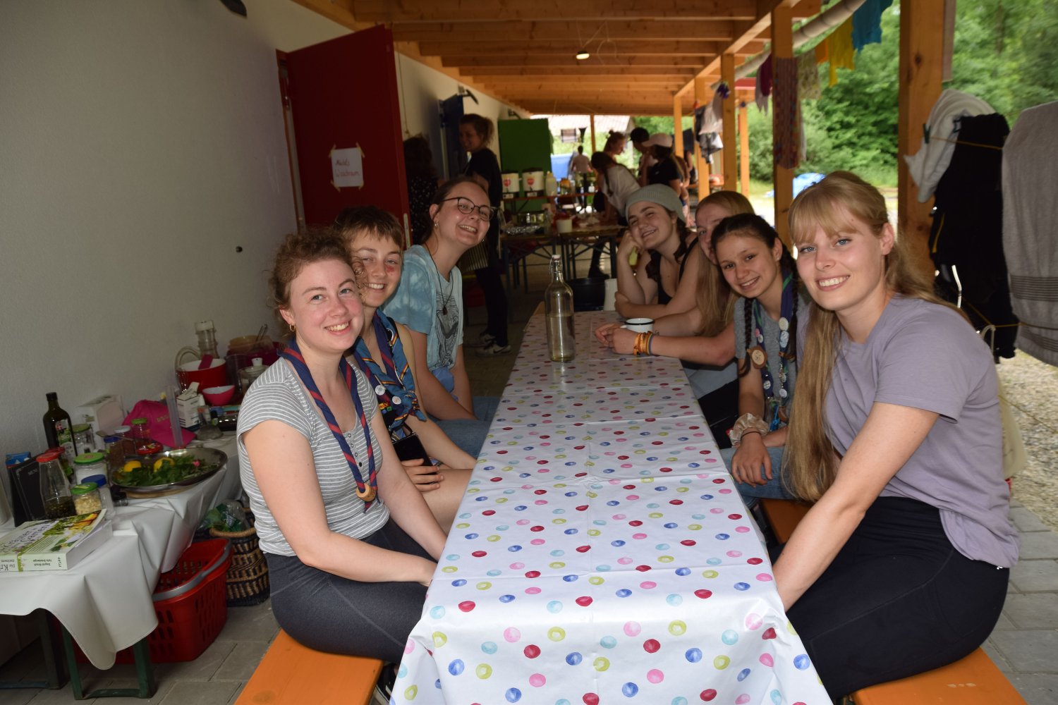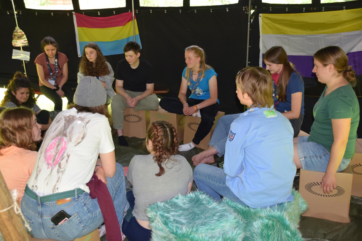 Im Regenbogenzelt fand auch der ReBoRa (Regenbogenrat) statt, an dem Pfadfinderinnen* allen Alters teilnehmen konnten, um ihre Meinungen, Wünsche und Bedürfnisse zu äußern.  Gleichberechtigt mit den Leiterinnen* konnten sich alle austauschen, diskutieren und Kompromisse schließen. So konnten wir die basisdemokratischen Strukturen unseres Verbands auch auf dem Lager aufrechterhalten und allen Teilnehmerinnen* eine Stimme geben.
